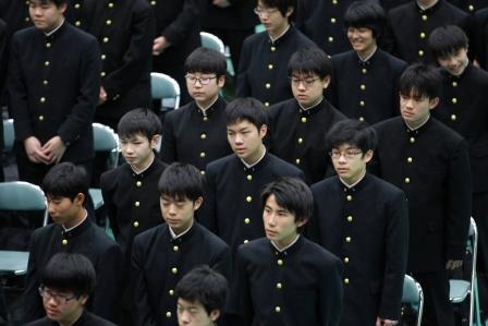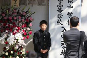中学生は、真新しい制服に身を包み、緊張した面持ちで付き添いの方々と登校し、式の前後で記念撮影。