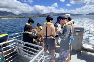 シュノーケリングや海洋生物ウォッチングを行った海コースでは、間近でイルカを見たりウミガメと共に泳ぐことができました。また、ハワイの海の様子やマイクロプラスチック等の問題も知り、大切な自然を守っていくために、一人ひとりができることを学びました。